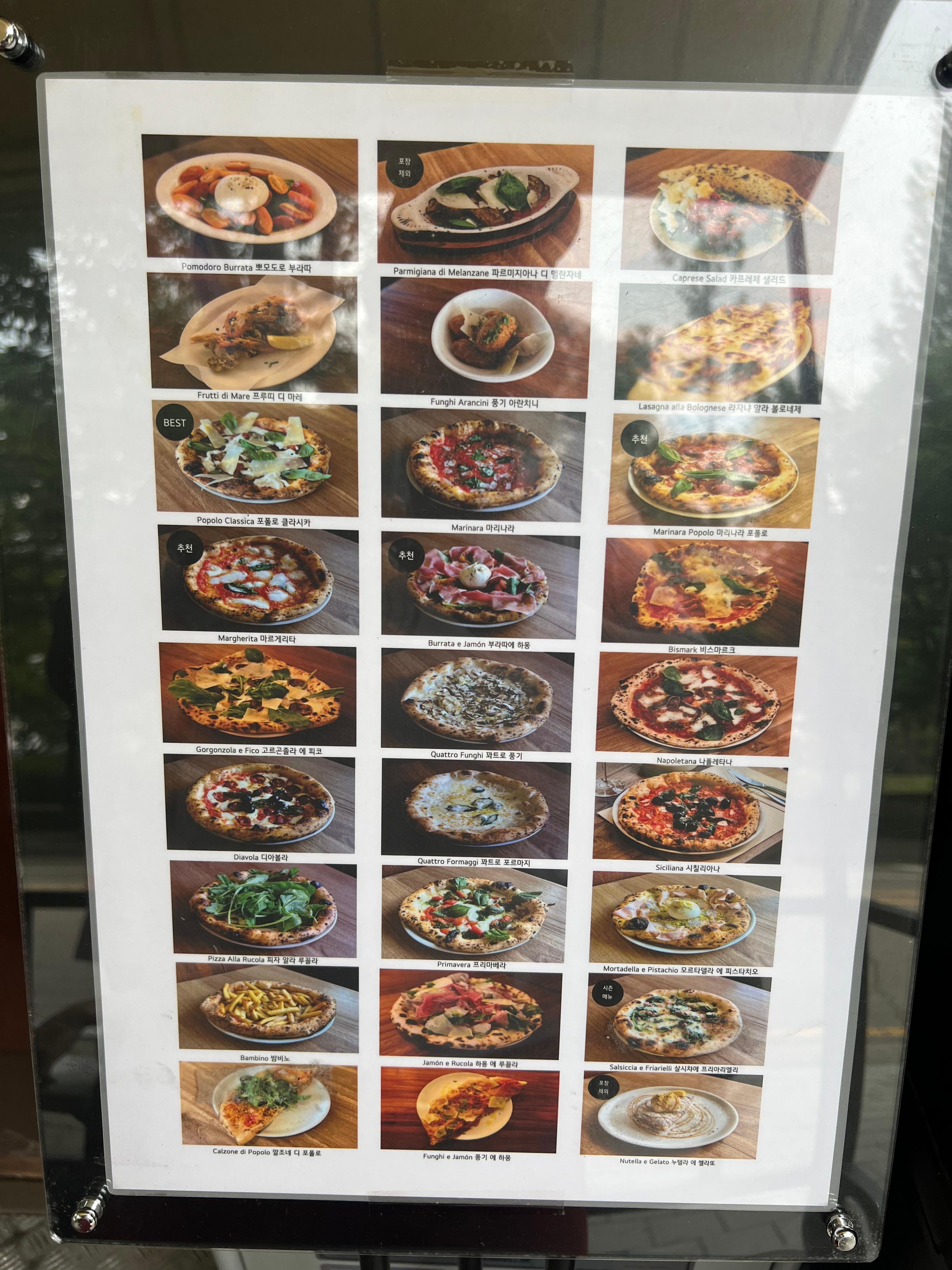 - 메뉴 : 피자(포폴로 클라시카, 마리나라, 마리나라 포폴로, 마르게리타, 부라타 에 하몽, 비스마르크, 고르곤졸라 에 피코, 콰트로 풍기, 나폴레타나, 디아볼라, 콰트로 포르마지, 시칠리아나, 피자 알라 루꼴라, 프리마베라, 모르타델라 에 피스타치오, 밤비노, 하몽 에 루꼴라, 살시차 에 프리아리엘리, 깔조네 디 포폴로, 풍기 에 하몽), 파스타(라자냐 알라 볼로네제, 스파게티 알 페스토 디 루꼴라), 카프레제샐러드,프루띠디마레,풍기 아란치니, 뽀모도로 부라타, 파르미지아나 디 멜란자네 등