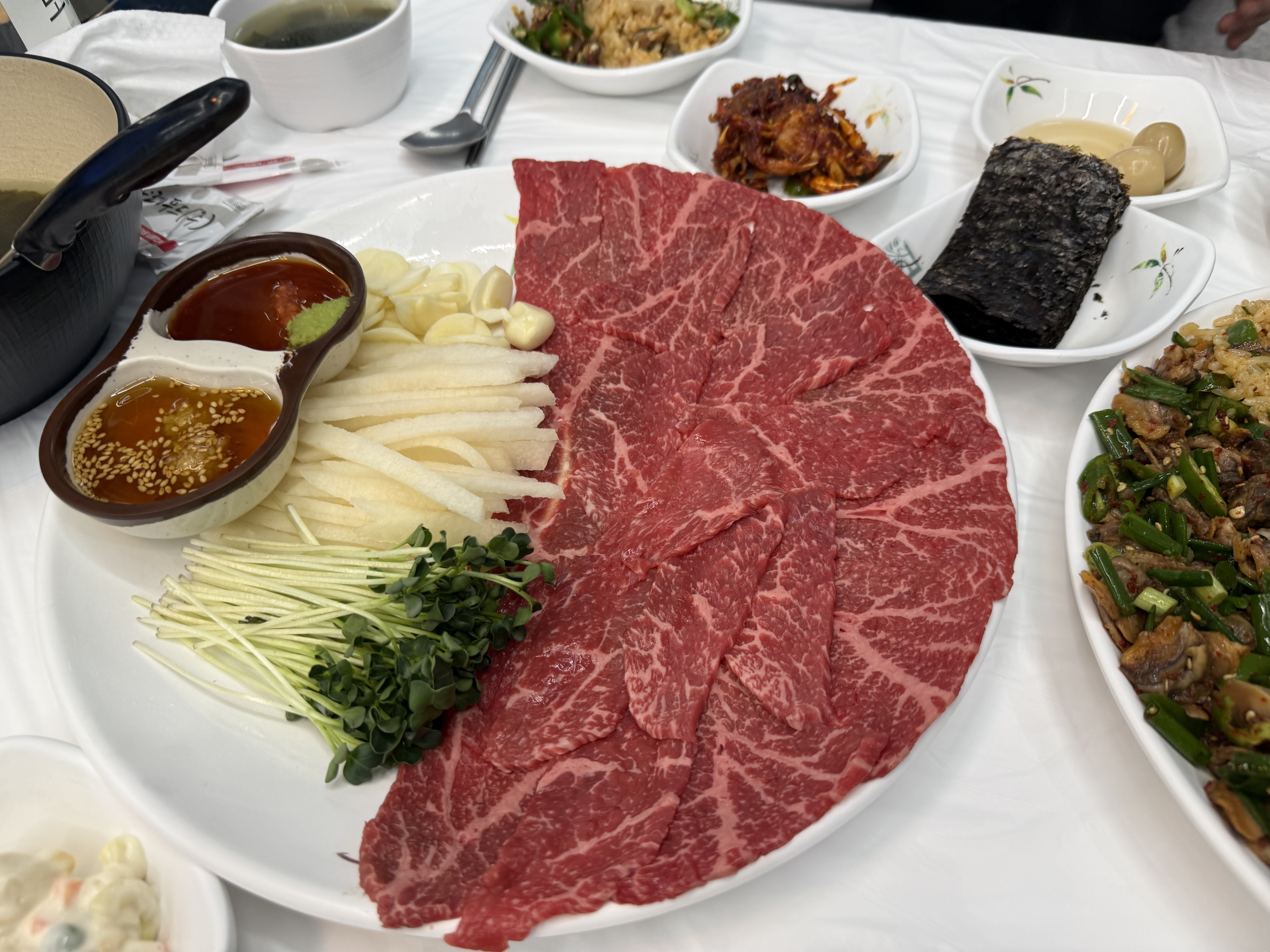 육회를 좋아하시는 분은 육회도 추천드리겠지만... 저는 입안 가득 찬 식감을 좋아하기도 하고 단맛을 그리 좋아하는 편이 아니라 육회보다는 육사시미를 즐겨 먹습니다. 질 좋은 고기로 마블링도 좋고 식감도 좋았으며, 배도 너무 맛있어서 사실 간식 먹고 와이프와 둘이 가서 이거 남겨서 포장하자였지만.... 둘이 다 먹었습니다 ㅋㅋ